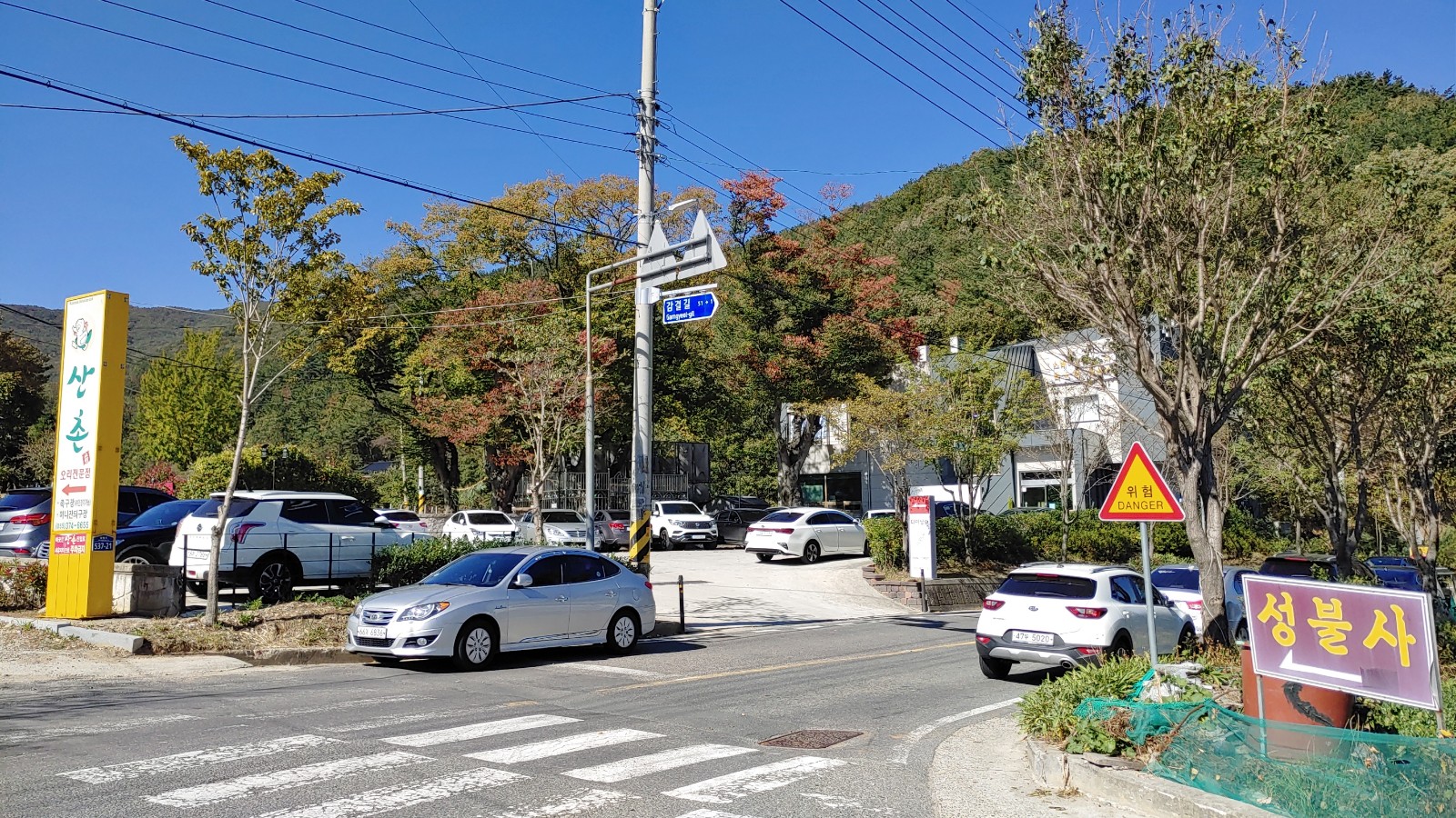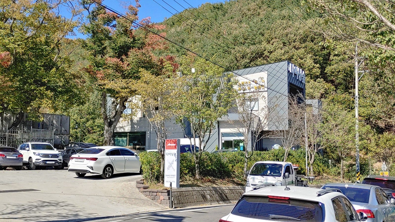 주차장에 주차할 곳이 없어서 여기 국도변에 다이닝숲 손님들이 주차한 차량으로 행렬을 이루고 있다.
