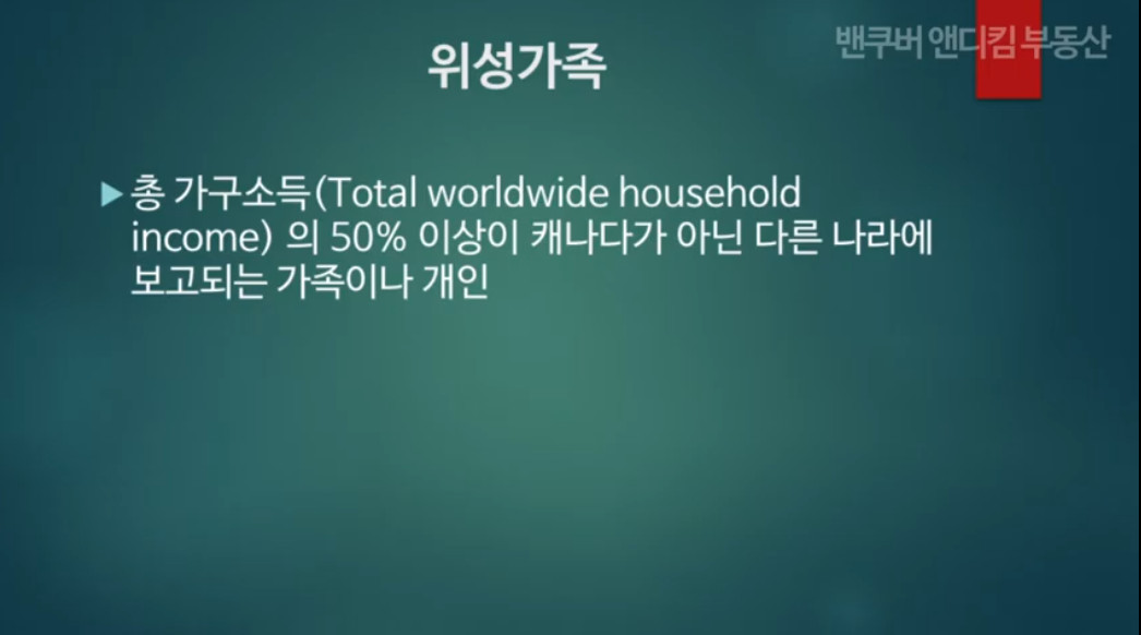 외국인 소유자일 경우, 전체 소득의 50% 이상의 소득이 캐나다 밖에서 발생할 경우이며 캐나다에서 세금보고를 하지 않는 경우 Satellite family로 간주됩니다.