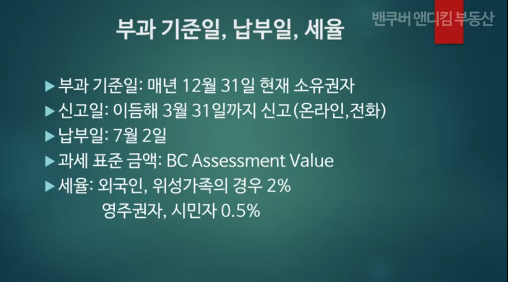 2) 공시지가의 0.5% 부과 – 비씨주에 거주하는 시민자 / 이민자