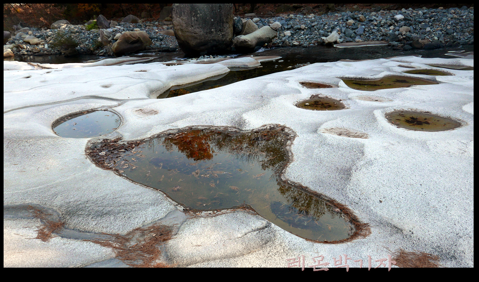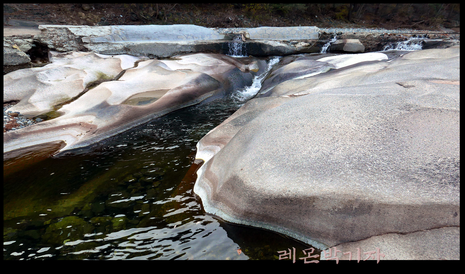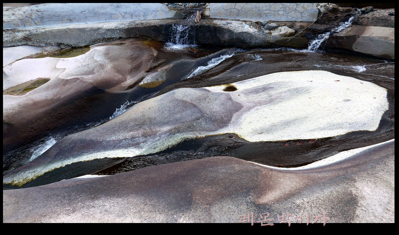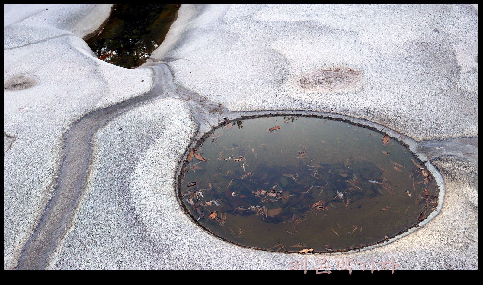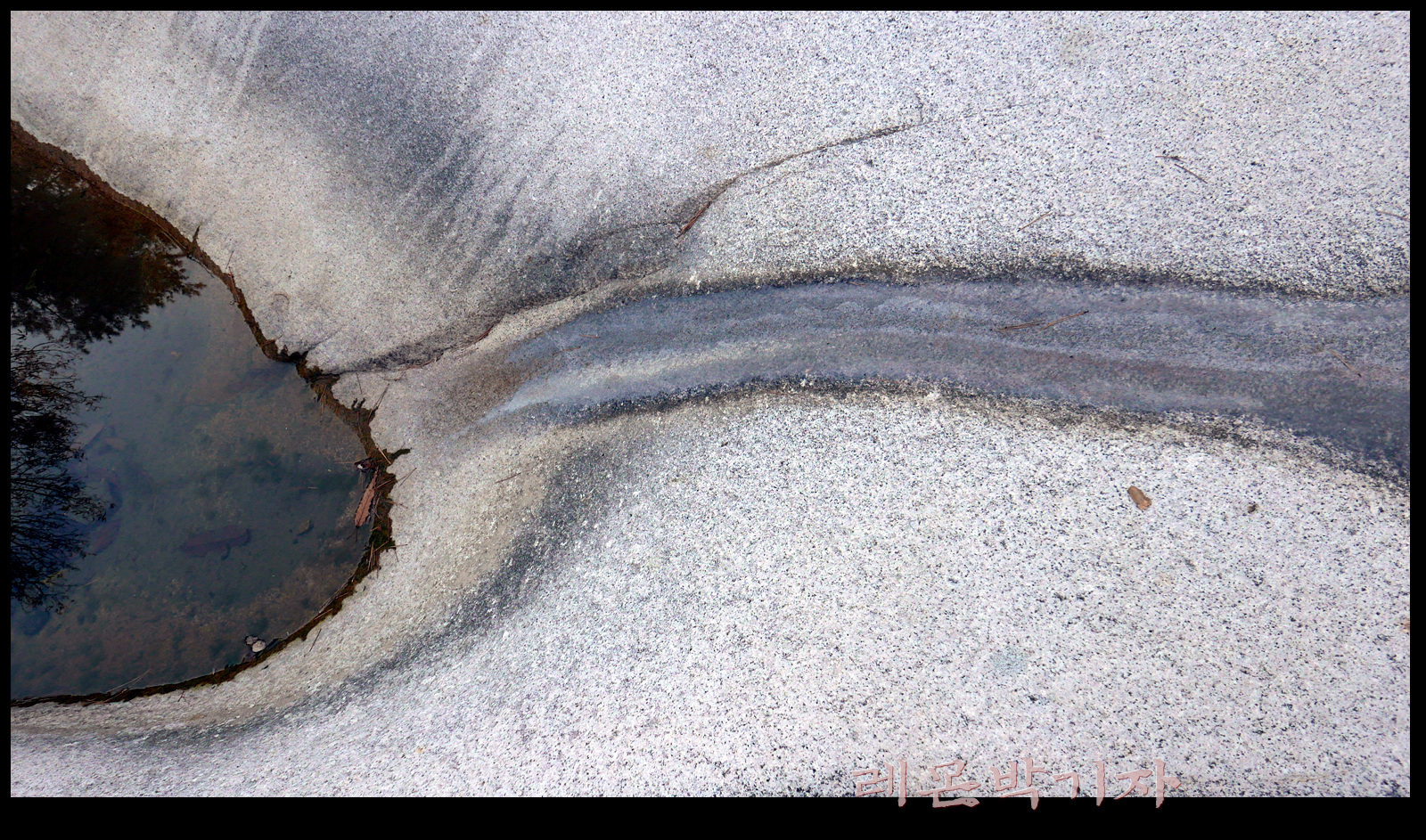 바위 위에 작은 웅덩이가 생기고 그 웅덩이에 모인 물이 또 물길을 만들어 흘러간다.
