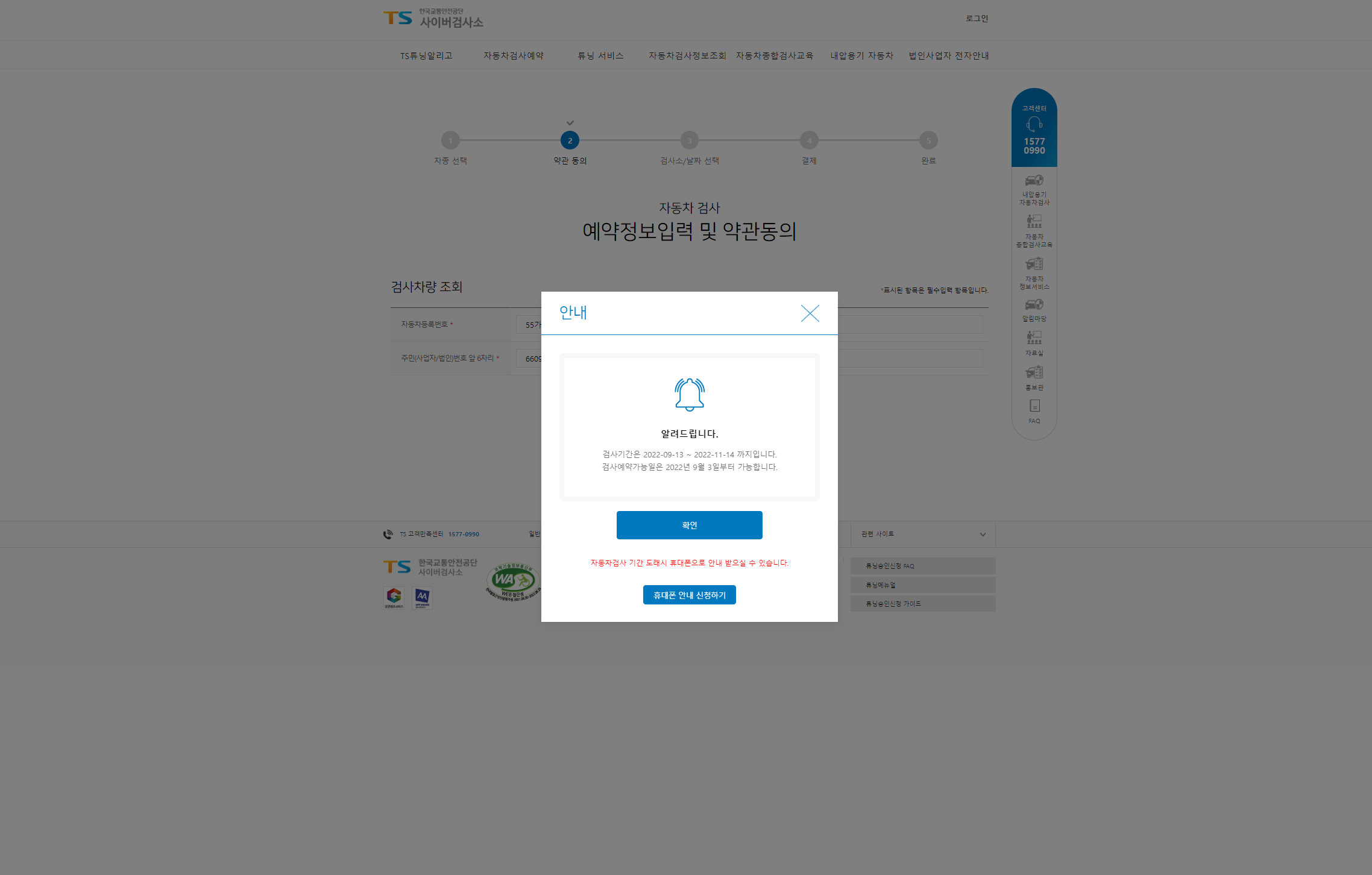 검사기간을 확인했으면 그 아래에 있는 휴대폰 안내 신청하기를 눌러