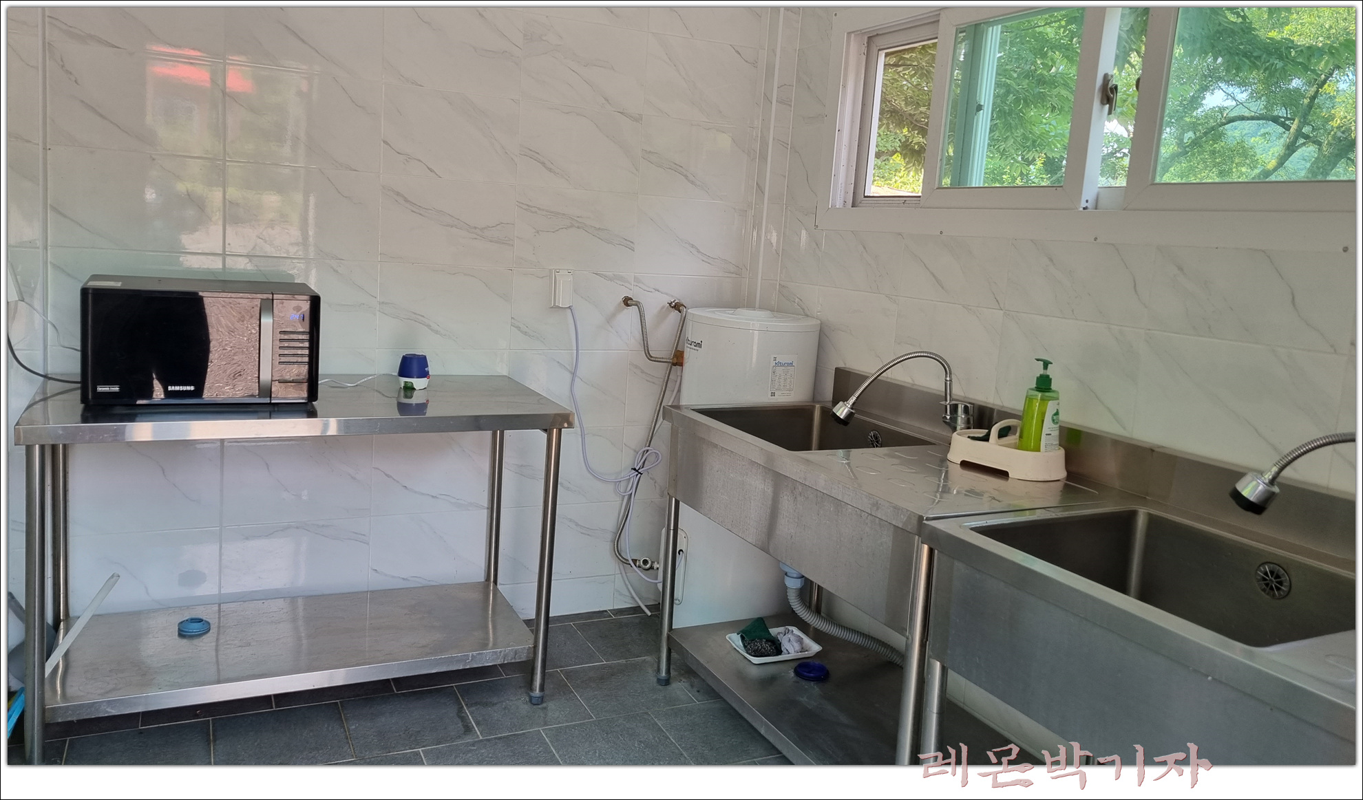 그래서 밥이나 뎁혀 먹을 음식은 여기 계수대로 와야 하고