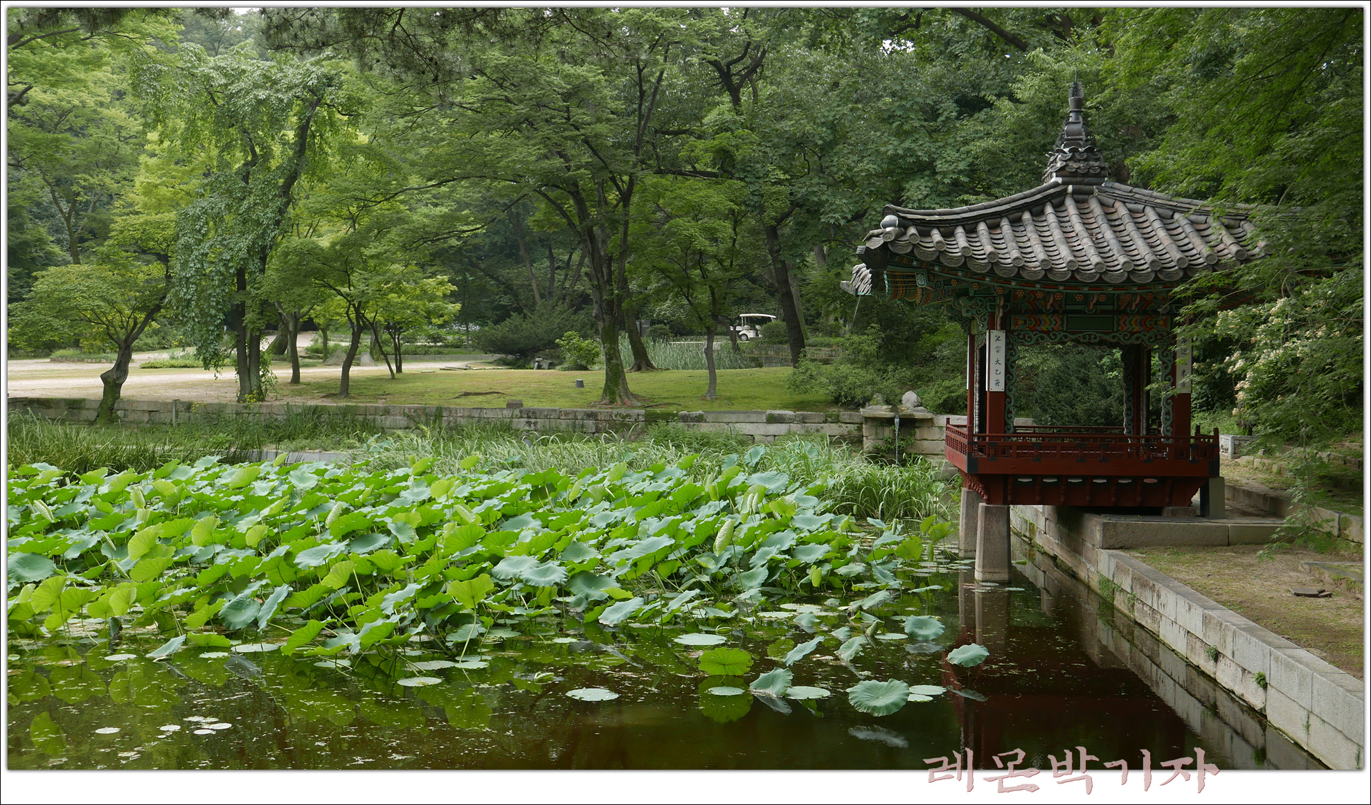 지금 그 섬은 없어졌고, 정자는 지금도 연못 북쪽 끝에 있다.